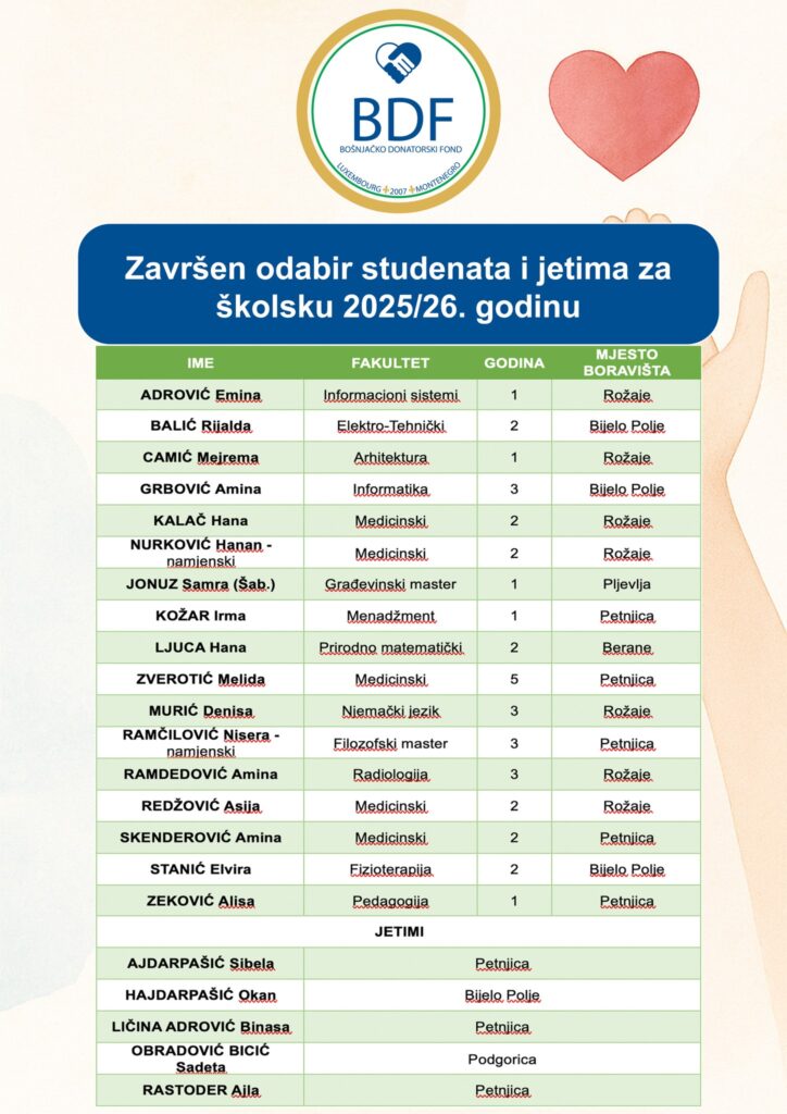 Po sedamnaesti put, Bošnjačko donatorski fond (BDF) sproveo je izbor studenata i jetima koji će u školskoj 2025/26. godini biti korisnici naših stipendija.